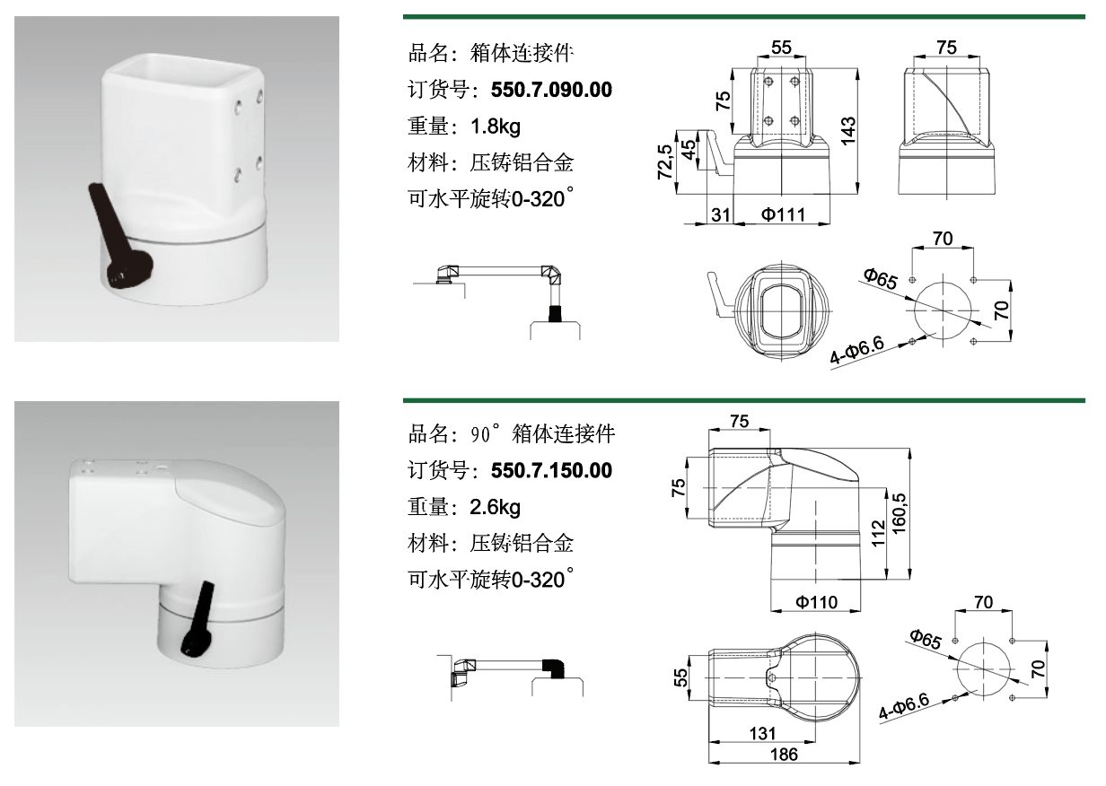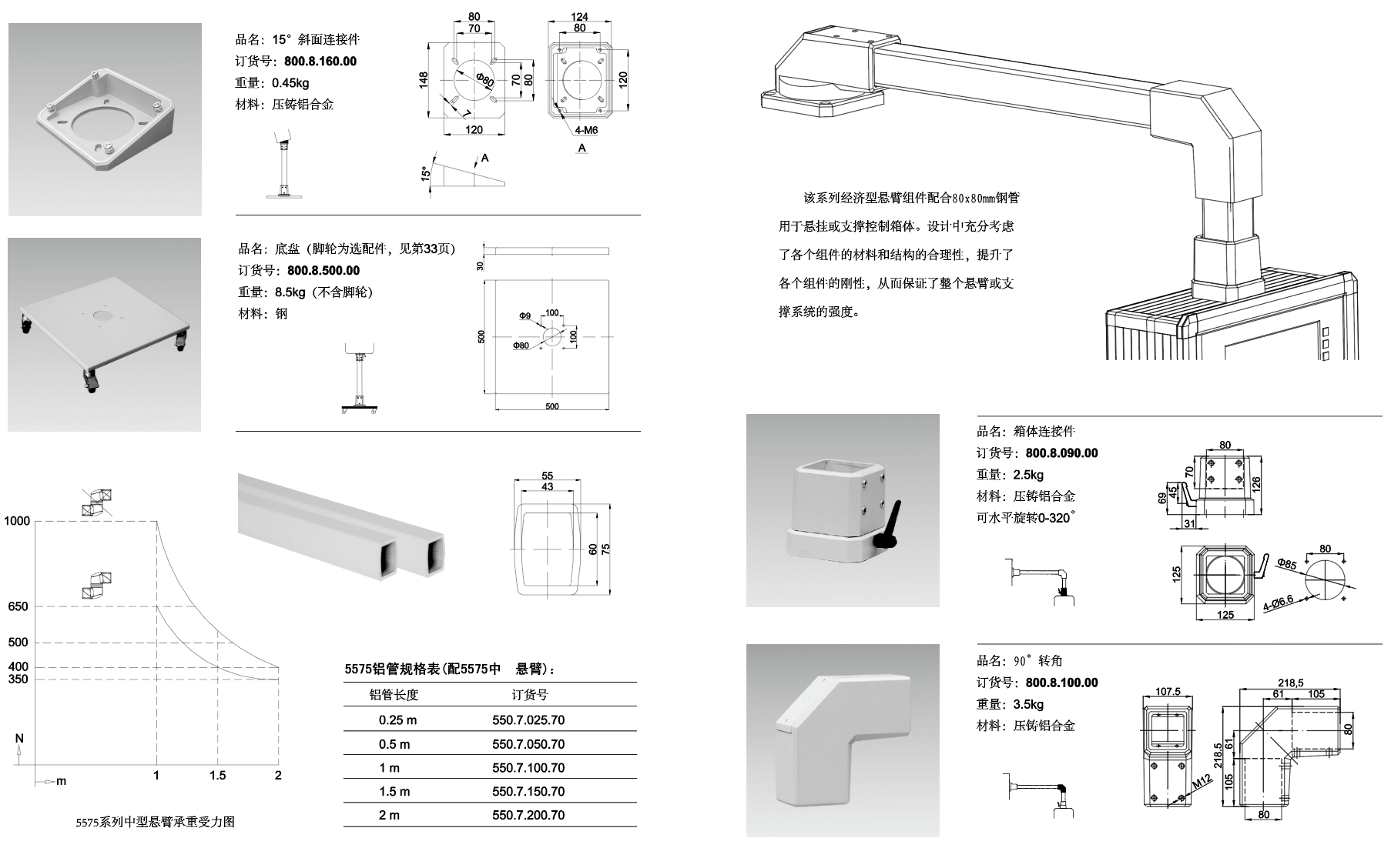 该系列中型悬臂组件配合55x75mm铝管,用于悬挂或支撑控制箱体。铝管采用阳极氧化表面处理,组件全部采用铝合金压铸工艺制造,在保证强度及合理的结构下,更注重了外观的特有风格。