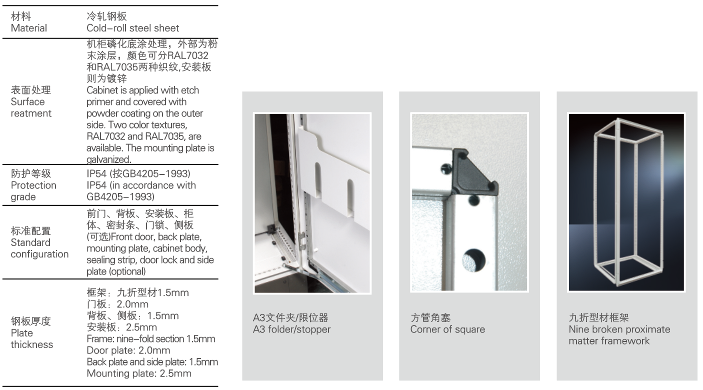 ·独特的九折型材整体焊接而成的主体框架不但确保柜体的高强度而且使柜体的防护等级达到IP54
