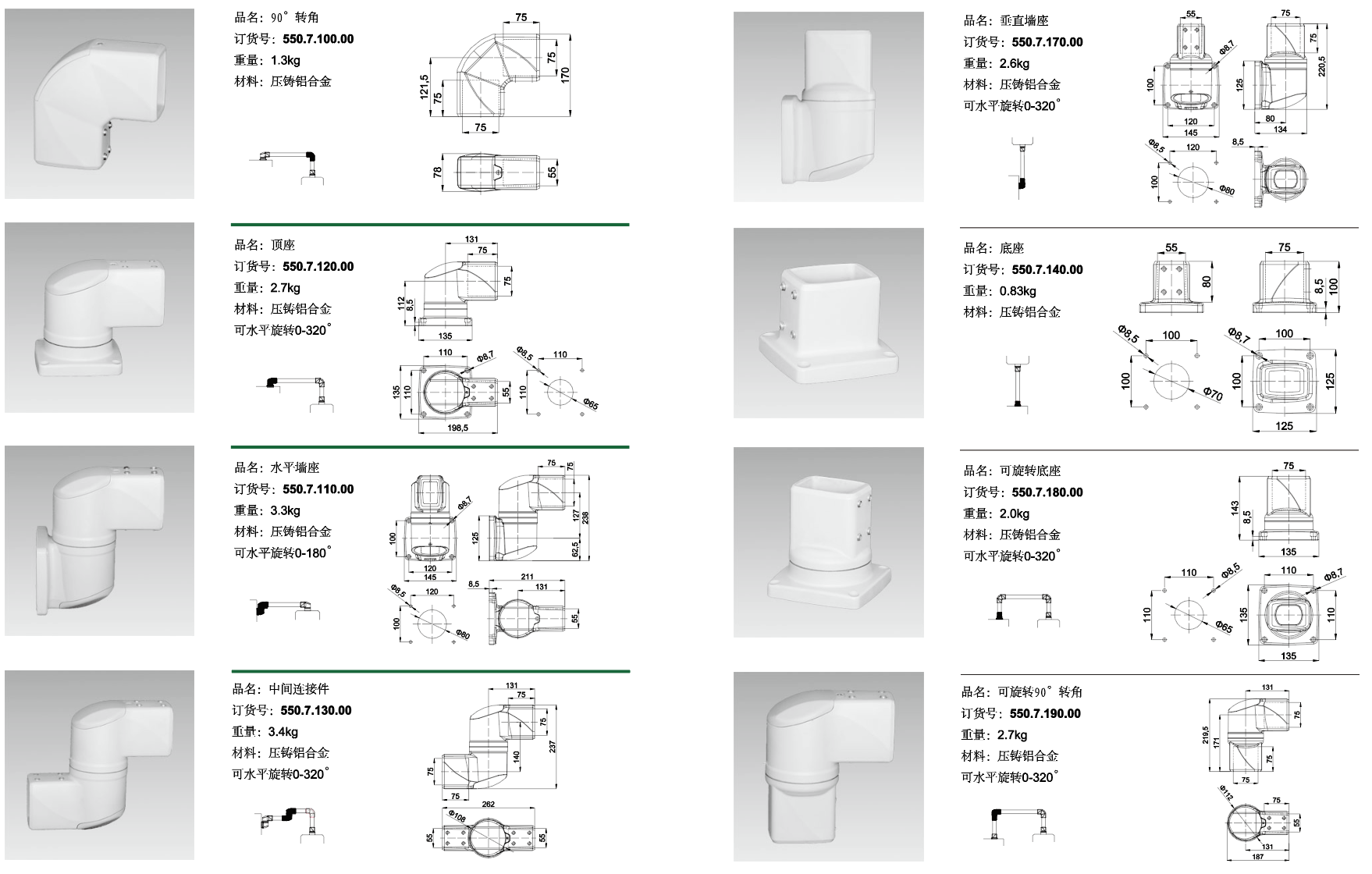 该系列中型悬臂组件配合55x75mm铝管,用于悬挂或支撑控制箱体。铝管采用阳极氧化表面处理,组件全部采用铝合金压铸工艺制造,在保证强度及合理的结构下,更注重了外观的特有风格。